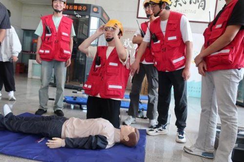 随后,由学生应急协同救护队成员负责对失去行动能力的被困学生开展应急救护,并利用假人向现场师生讲解心肺复苏要点,现场学生进行实操演练,增强大学生面对紧急突发情况时的自救互救能力,充分做好应对准备。