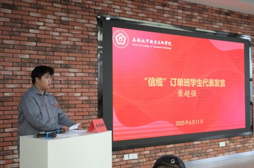 图4:校企合作签约 “信缆”订单班学员代表柴超强同学在发言中表达了对学校和企业提供本次宝贵学习机会的感激之情,他表示:今天,我们以加入订单班为荣;明天,我们将以优异的成绩为学校和企业争光!
