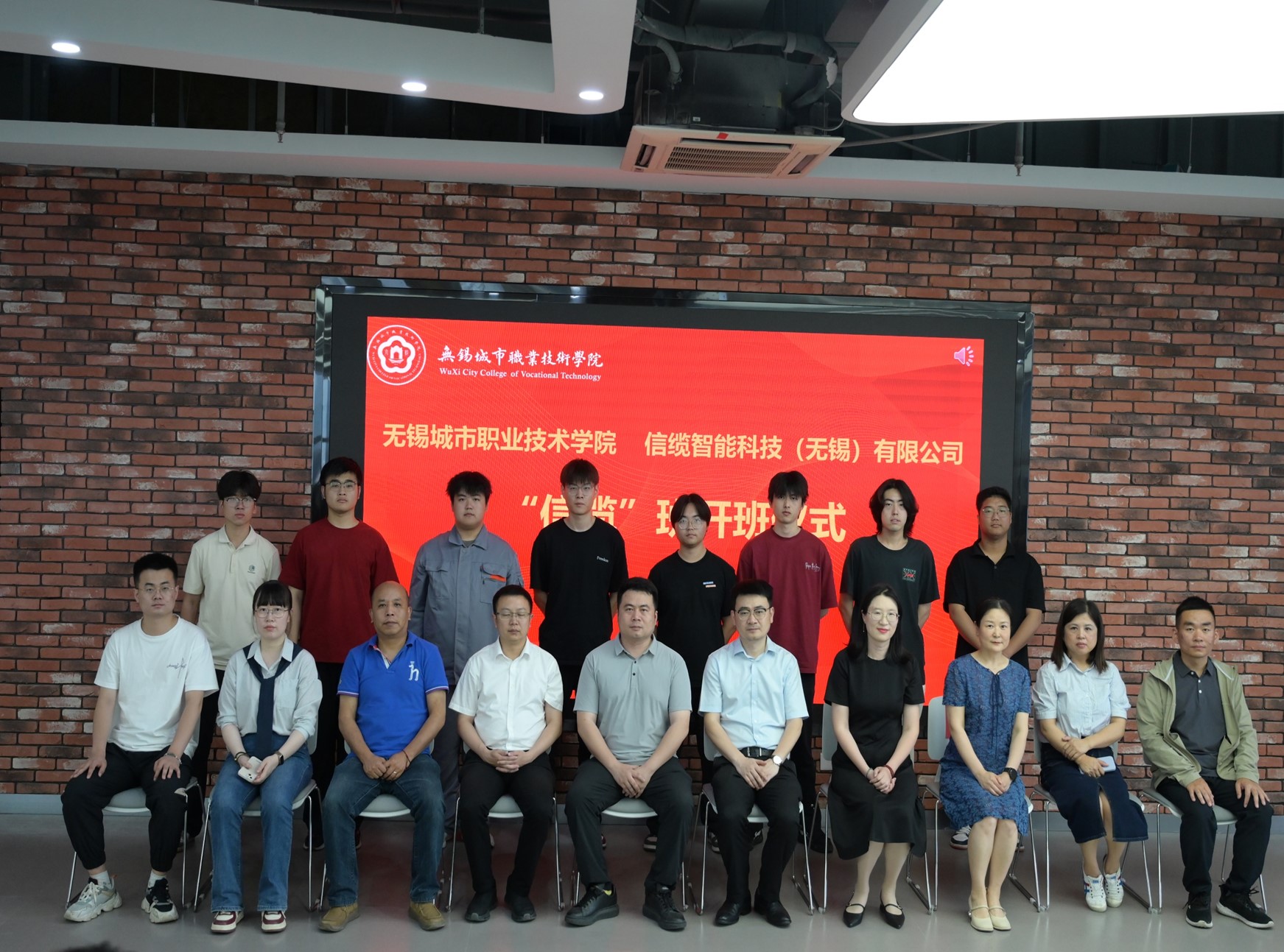 图1:开班仪式合影 开班仪式上,林俊首先对出席“信缆”订单班的行业企业领导及师生表示热烈的欢迎,对信缆智能科技(无锡)有限公司对我校订单班工作的大力支持表示感谢。同时表示订单班将不断完善课程标准,基于企业岗位标准,开发基于岗位标准的教学内容,持续完善学徒制特点的教学管理制度。最后,他殷切希望订单班学员珍惜学习机会,掌握行业应用真本领,锤炼企业所需真技术。