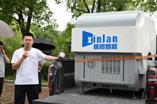 图5:学生代表柴超强发言 最后,信缆智能科技(无锡)有限公司在报告厅和图书馆楼前,向大家展示了公司泛低空智联网平台应用和无人机机场指挥车产品。
