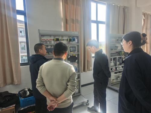 验收工作遵循“设备调试—功能展示—成果研讨”的流程有序推进。验收组首先来到实训室4303,重点对实验室核心设备的运行状态进行演示操作。华晟经世技术团队现场操作工业互联网网关、边缘计算节点等关键设备,逐一测试数据采集、远程监控、智能分析等核心功能,确保设备性能稳定、接口兼容、数据交互顺畅。校领导林俊仔细询问设备技术参数与教学适配性,强调实验室建设要“立足教学实际,服务产业需求”。