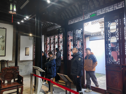在祝大椿故居,在讲解员的引导下,党员同志们认真聆听祝大椿先生从无锡出发、于上海滩纵横驰骋,被誉为“电气大王”的创业历程,仔细端详泛黄的历史照片、珍贵的实业文献以及复原的生产器具,深入了解他创办实业、推动近代工业革新的艰辛探索;在非遗展示区域,大家通过文字介绍与实物陈列,深切感受故居作为戏曲音乐博物馆活化利用的创新实践,深刻体会传统文化与工业遗产的融合共生;讲解员着重讲述了祝大椿先生致富后捐资办学、修缮古迹、赈灾济民的公益事迹,使大家深刻感悟到这位近代实业家“敬教劝学”的责任担当与“回馈社会”的高尚情怀。